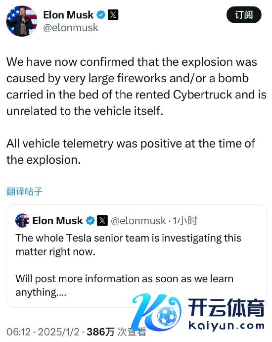 马斯克在社媒平台X上发帖称,特斯拉已说明拉斯维加斯特朗普酒店外一辆Cybertruck爆炸是由荒谬大的烟花和/或放弃在车底的炸弹引起的,与车辆自己无关。该车为租出车。